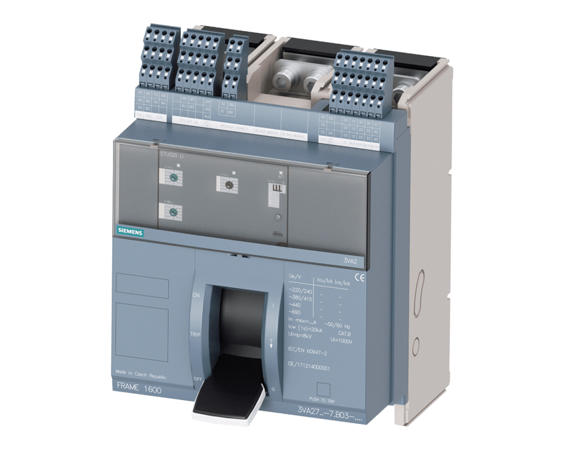 DISJUNTOR CAIXA MOLDADA | NUMERO POLOS: TRIPOLAR | BASE: FIXA | TENSAO NOMINAL: 690V | CORRENTE NOMINAL: 1600A | FREQUENCIA: 60HZ | CAPACIDADE RUPTURA (ICU): 85KA | GRAU PROTECAO: IP-20 | MODELO: SENTRON | MARCA: SIEMENS | REFERENCIA: 3VA27166AC030AA0