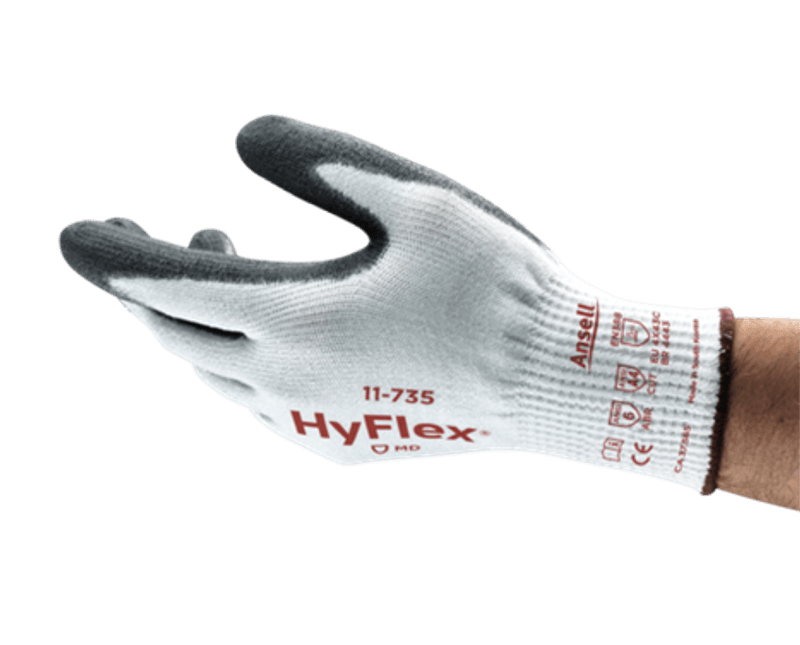LUVA | TIPO: PROTECAO MECANICA | MATERIAL: FIBRA RESISTENTE CORTE | COR: BRANCA/PRETA | PALMA: POLIURETANO | TAMANHO: 9 | MODELO: HYFLEX | MARCA: ANSELL | REFERENCIA: 11735