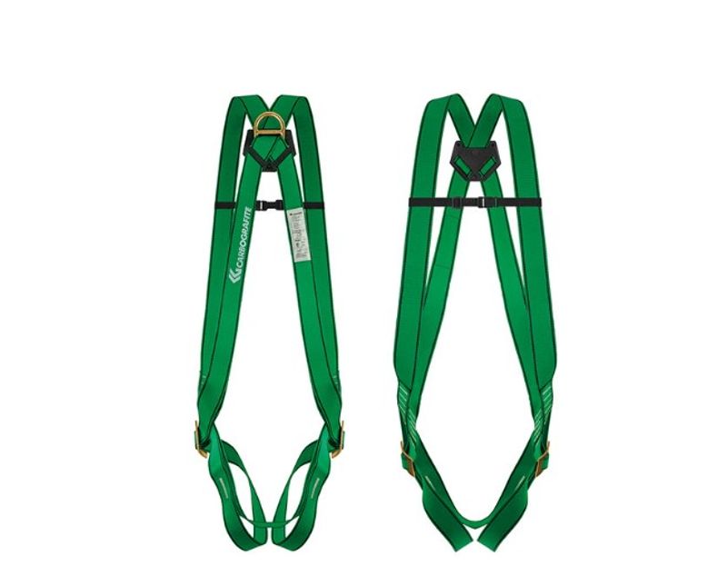Fabricado em fita de poliéster. Ajustes através de fivelas curvadas: Duas localizadas nas pernas. Uma meia argola em aço forjado bicromatizado: Dorsal para retenção de queda. Proteção Subpélvica.