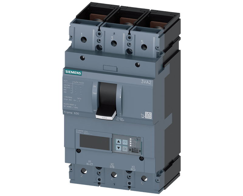 DISJUNTOR 3VA2 IEC FRAME 630 CLASSE DA CAPACIDADE DE COMUTAÇÃO E ICU=200 KA - 415 V DE 3 POLOS, PROTEÇÃO DE MOTOR ETU860M, LSIG, IN=500A PROTEÇÃO CONTRA SOBRECARGA IR=160A .. 500A PROTEÇÃO CONTRA CURTO-CIRCUITO ISD=1,2..12XIN, II=3..12XIN CONEXÃO ROSCADA PLANA DISJUNTOR COMPACTO 3VA2 COM ETU FILAS DE 8 PARA PROTEÇÃO DE INSTALAÇÕES. OS DISJUNTORES COMPACTOS 3VA DA SIEMENS, SENDO UM ELEMENTO IMPORTANTE DOS COMPONENTES DE PROTEÇÃO SENTRON, AO NÍVEL DE APLICAÇÕES INDUSTRIAIS E NA ÁREA DAS INFRAESTRUTURAS, REPRESENTAM UMA PROTEÇÃO EFETIVA PARA INSTALAÇÕES, ARRANCADORES E MOTOR, GRAÇAS AO DESLIGAMENTO SEGURO EM CASO DE SOBRECARGA E CURTO-CIRCUITO. OS DISJUNTORES COMPACTOS 3VA SÃO, ASSIM, UMA REFERÊNCIA AO NÍVEL DA FLEXIBILIDADE E VERSATILIDADE DOS ACESSÓRIOS MODULARES. ACESSÓRIOS UNIFORMES PARA VÁRIOS TAMANHOS DE TODAS AS SÉRIES DE DISJUNTORES COMPACTOS 3VA1 E 3VA2. ESTA VARIANTE DO DISJUNTOR COMPACTO 3VA DISTINGUE-SE SOBRETUDO POR: 1. MODELO COMPACTO. 2. DISPONÍVEL COMO VARIANTE PARA PROTEÇÃO DE INSTALAÇÕES E PROTEÇÃO DO GERADOR. 3. DISPONÍVEL COMO VERSÃO DE 3 E 4 POLOS. 4. QUATRO CLASSES DE PODER DE CORTE/DE FECHO DE 55 KA..150 KA COM 415 V.5. DEPENDENDO DO TAMANHO: CORRENTE ESTIPULADA 25 A.630 A. 6. POSSIBILIDADE DE MONTAGEM EM MONTAGEM FIXA, TÉCNICA DE ENCAIXE, UNIDADE EXTRAÍVEL. 7. A SÉRIE DISPÕE DE UM DISPOSITIVO DE ATIVAÇÃO DE SOBRECORRENTE ELETRÓNICO. 8 DISPÕE DE UM VISOR INTEGRADO PARA INDICAÇÃO DOS VALORES MEDIDOS. 9 FUNÇÃO DE MEDIÇÃO INTEGRADA E LIGAÇÃO DE COMUNICAÇÃO OPCIONAL ATRAVÉS DE MODBUS TCP, MODBUS RTU, PROFINET E PROFIBUS. 10. ACESSÓRIOS INTERNOS MODULARES E DE FÁCIL MONTAGEM COM MÚLTIPLAS FUNÇÕES.