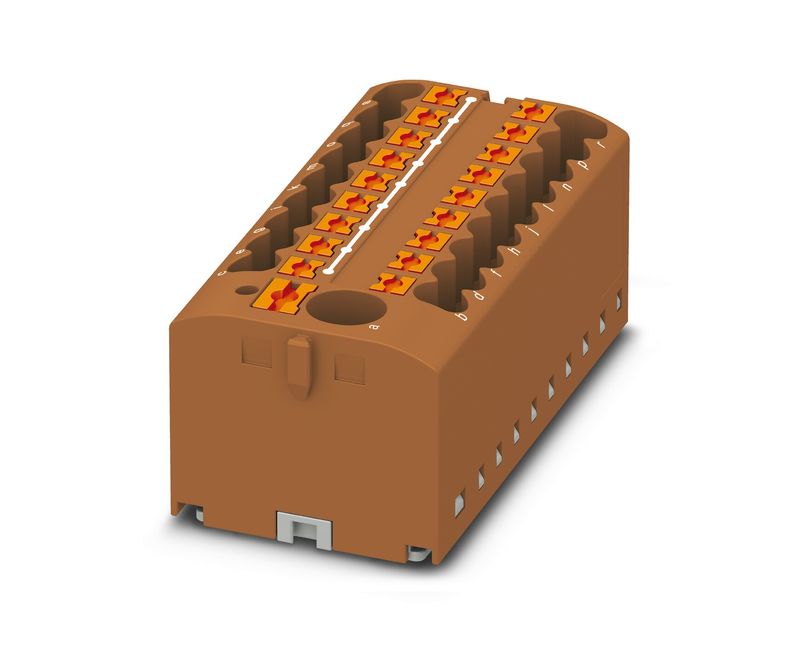 BLOCO CONECTOR PASSAGEM | MATERIAL: POLIAMIDA (NYLON) | COR: MARROM | MONTAGEM: ENCAIXE ADAPTADOR TRILHO | TENSAO NOMINAL: 450V | CORRENTE: 24A | QUANTIDADE CONEXOES: 19 CONEXOES | SECAO CABO: 0,14-4MM2 | SINALIZACAO: SEM SINALIZACAO | MARCA: PHOENIX CONTACT | REFERENCIA: PTFIX618X2,5