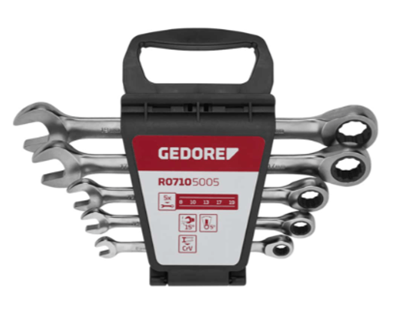 CHAVE COMBINADA JOGO | COMPOSICAO: 12 PECAS | TIPO: PLANA | FORMA: STANDARD | COM CATRACA: C/CATRACA | PERFIL: SEXTAVADO/ESTRIADO | MATERIAL: ACO CROMO VANADIO | TRATAMENTO SUPERFICIAL: CROMADO FOSCO | EMBALAGEM: SUPORTE PLASTICO | TAMANHO: 8-19MM | MODELO: R0710 | MARCA: GEDORE | REFERENCIA: R07105012