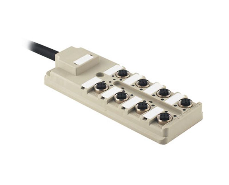 CAIXA DISTRIBUICAO SENSOR | MATERIAL: COMPOSTO TERMOPLASTICO | PADRAO SENSOR: M12 | INDICADOR: C/LED | NUMERO POLOS: 5 POLOS | NUMERO PONTOS ENCAIXE: 8 VIAS | TENSAO NOMINAL: 10-30V | GRAU PROTECAO: IP-68 | COMPRIMENTO CABO: 3M | MARCA: WEIDMULLER CONEXEL | REFERENCIA: SAI8F