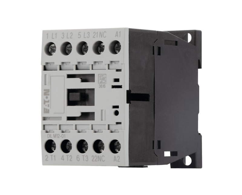 O contato principal é normalmente aberto, com um contato auxiliar contendo 1NA. Seu controle é feito através de um sistema elétrico, permitindo alternância rápida de energia. Seu modelo é DILM1210 e pertence à marca Eaton.