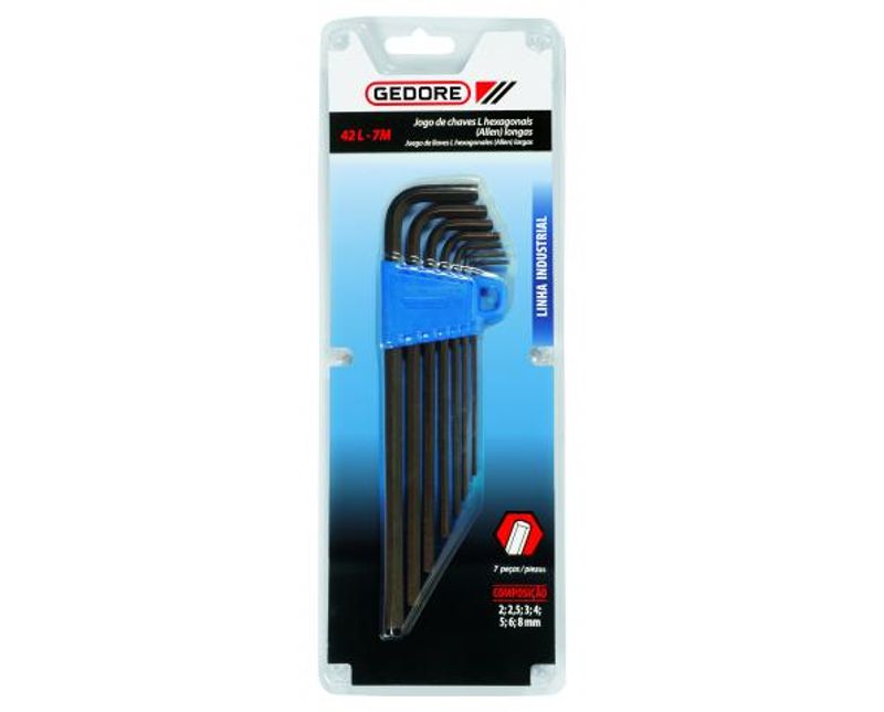 CHAVE L JOGO | COMPOSICAO: 8 PECAS | TIPO: SEXTAVADA (ALLEN) | FORMA: LONGA | MATERIAL: ACO CROMO VANADIO | TRATAMENTO SUPERFICIAL: FOSFATIZADO | EMBALAGEM: SUPORTE/ENCARTELADO | TAMANHO: 2-10MM | MARCA: GEDORE | REFERENCIA: 42L88M