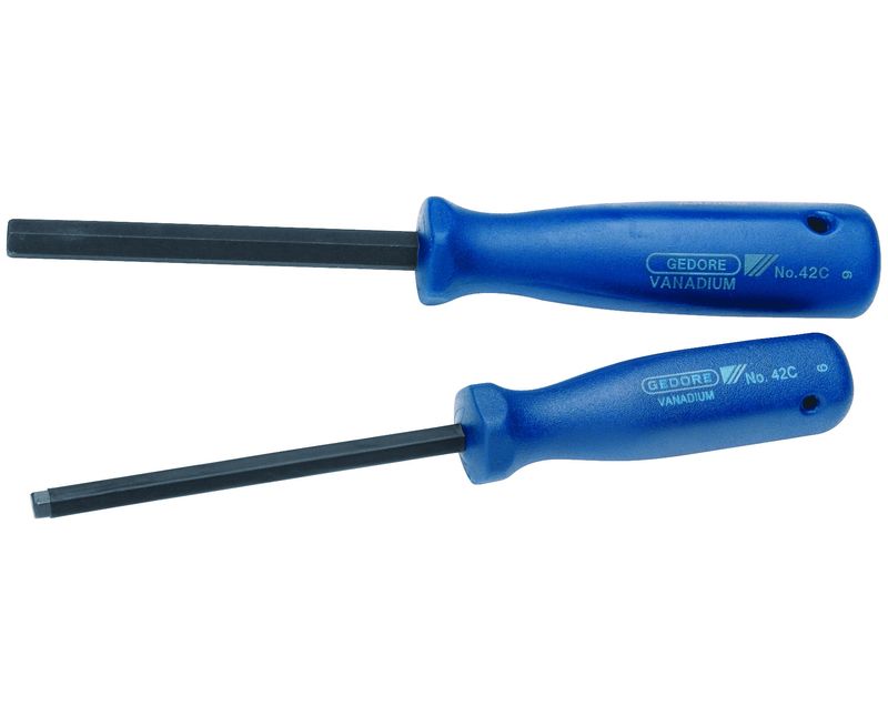 CHAVE SEXTAVADA (ALLEN) CABO RETO | MATERIAL: ACO CROMO VANADIO | TRATAMENTO SUPERFICIAL: ESCURECIDO | MATERIAL CABO: POLIMERO | TAMANHO PONTA (MM): 2,5MM | COMPRIMENTO TOTAL: 130MM | COMPRIMENTO HASTE: 50MM | COR CABO: AZUL | NORMA: DIN ISO 2936 | MODELO: 012402 | MARCA: GEDORE | REFERENCIA: 42C2,5MM