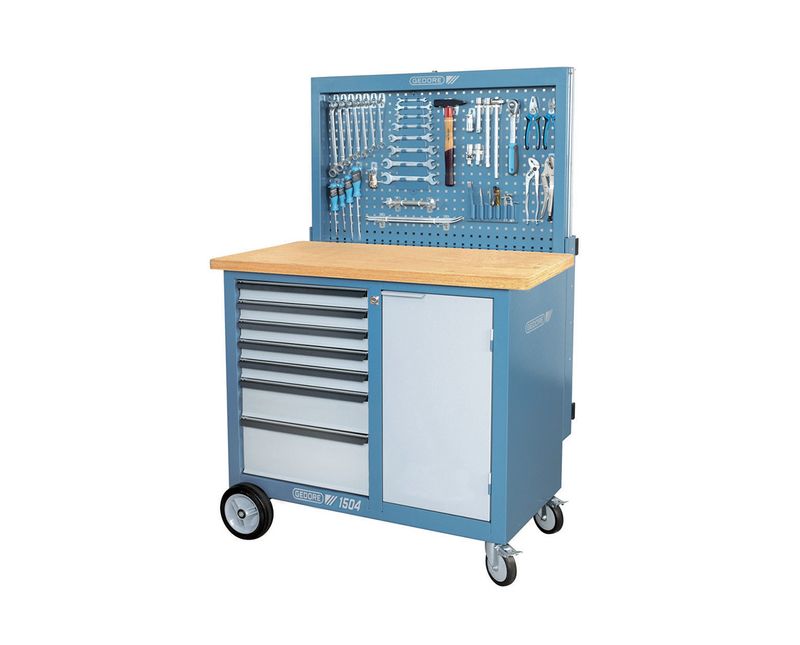 CARRO FERRAMENTA | TIPO: BANCADA | MATERIAL ESTRUTURA: ACO CARBONO | TRATAMENTO: PINTURA | MATERIAL TAMPO: MADEIRA | PORTA: SEM PORTA | GAVETA: SIM | NUMERO GAVETAS: 7 GAVETAS | COR: AZUL | C/ FREIO: NAO | ALTURA (MM): 1625MM | LARGURA (MM): 1100MM | PROFUNDIDADE (MM): 620MM | INFORMACOES ADICIONAIS: C/PAINEL RETRATIL | MARCA: GEDORE | REFERENCIA: BR1504L