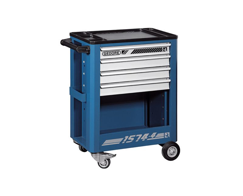 Estrutura em chapa reforçada de aço especial, com rodas e rodízios em núcleo de polímero e banda de borracha, base de trabalho em polímero. Estrutura e gavetas com acabamento em pintura na cor azul padrão Gedore, puxadores com acabamento em pintura na cor preta padrão Gedore. Carro resistente e soldado, apresenta grande estabilidade. A base de trabalho em polímero, com divisórias para organizar as atividades do operador e proteger a estrutura metálica do carro, contra vazamento de líquidos em geral. Suas rodas e rodízios estão estrategicamente posicionados, evitando o tombamento do carro, mesmo com a gaveta totalmente aberta. Duas rodas são fixas e duas giratórias, uma delas com freio. O espaço interior do carro possui abas de proteção, com acesso apenas por um dos lados. É fornecido com kit puxador e pequena caixa metálica que pode ser fixada em uma das laterais do carro. As gavetas são fixadas em trilhos telescópicos. A versão básica ref. 1574 - 4 apresenta 4 gavetas pequenas, mas o carro 1574 ainda é fornecido com 5, 6 ou 7 gavetas. Possui fechadura central com furação redonda 8,3 mm, que permite o uso de cadeado (não incluso). Para melhor organização, permite utilização de Berços em EVA ref. 1500 CT1, 1500 CT2 e 1500 CT3, à serem adquiridos separadamente. Dicas de segurança: " Respeite as normas profissionais de segurança e o uso dos EPIs. " Respeite o limite de carga estática distribuída especificada para o Carro para ferramentas. " Respeite o limite de carga distribuída especificada para cada gaveta do Carro para ferramentas. " Sempre mantenha as gavetas do Carro para ferramentas fechadas e trancadas durante a movimentação. " Recomendamos abrir apenas uma gaveta por vez (quando cheia de ferramentas), para evitar tombamento do Carro. " Não exponha o Carro para ferramentas ao calor excessivo, para não comprometer as características do produto. " Não golpeie o Carro para ferramentas. " Não altere a forma original do Carro para ferramentas. " Não exponha / armazene o Carro para ferramentas em ambientes ácidos, úmidos ou salinos.