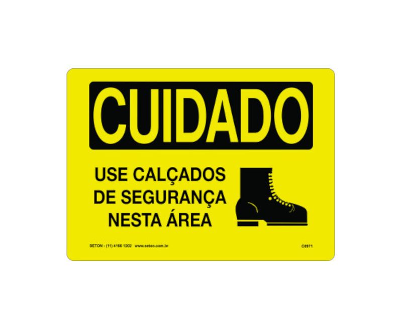 PLACA SINALIZACAO | MATERIAL: POLICLORETO POLIVINILA (PVC) | ACABAMENTO: VINIL AUTO ADESIVO | IDENTIFICACAO 1: CUIDADO | IDENTIFICACAO 2: USE CALCADOS DE SEGURANCA NESTA AREA | CORES: AMARELA/PRETA | IMPRESSAO: PRETA | DIMENSOES: 250X180MM | MARCA: BRADY | REFERENCIA: C0971B