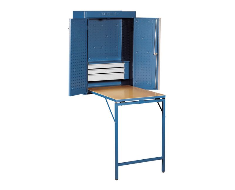 Em chapa reforçada de aço especial, tampo em madeira de chapas compensadas multilâminas naval, e apoio em polipropileno. Acabamento em pintura na cor azul padrão Gedore, tampo com proteção em pintura stain. Armário resistente e soldado. Sua principal característica é a flexibilidade na organização das ferramentas em seu interior, garantida devido aos encaixes padrão Gedore presentes nas suas paredes internas. Permite a utilização de ganchos e acessórios Gedore, vendidos separadamente, para que você organize o espaço de trabalho de acordo com a sua necessidade, que são: Gancho ref. 1500 H0 ao 1500 H3, 1401 H1 e 1401 H2, Suporte ref. VS 245 H. É equipado com 3 gavetas internas e fechadura central com 2 cópias de chaves. É ideal para armazenar e organizar as ferramentas utilizadas nas oficinas de manutenção de veículos, máquinas e outras aplicações. Armário possui dois furos com diâmetro de 16 mm, na parte de traz, para fixação na parede. Fornecido com ou sem ferramentas. Dicas de segurança: " Respeite as normas profissionais de segurança e o uso dos EPIs. " Respeite o limite de carga da prateleira e de cada gaveta. " Não exponha o Armário para ferramentas ao calor excessivo, para não comprometer as características do produto. " Não golpeie o Armário para ferramentas com bancada retrátil. " Não altere a forma original do Armário para ferramentas com bancada retrátil. " Não exponha / armazene o Armário para ferramentas com bancada retrátil em ambientes ácidos, úmidos ou salinos.