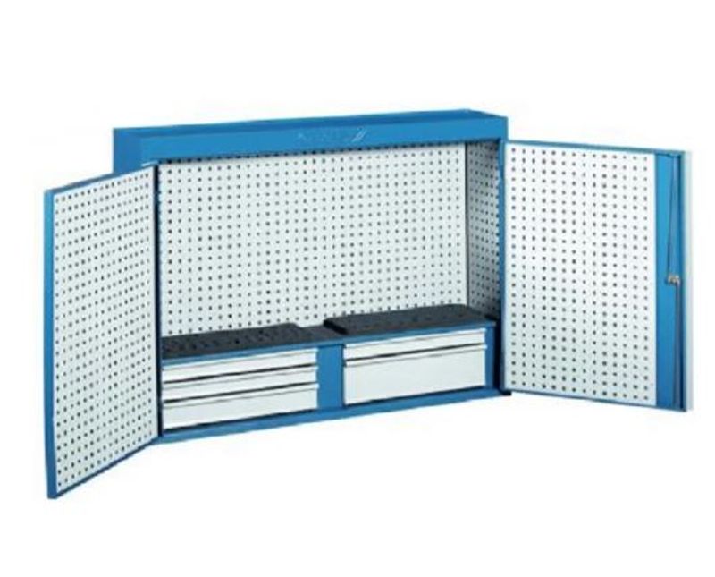 Em chapa reforçada de aço especial. Acabamento em pintura na cor azul padrão Gedore. Armário resistente e soldado. Sua principal característica é a flexibilidade na organização das ferramentas em seu interior, garantida devido aos encaixes padrão Gedore presentes nas suas paredes internas. É equipado com 5 gavetas internas e fechadura central, com 2 cópias de chaves. É ideal para armazenar e organizar as ferramentas utilizadas nas oficinas de manutenção de veículos, máquinas e outras aplicações. Armário possui dois furos com diâmetro de 16 mm, na parte de traz, para fixação na parede. Fornecido com ou sem ferramentas. O 1401 L é fornecido com suportes e ganchos móveis, para distribuir as ferramentas, mas aceita outros ganchos e acessórios Gedore, vendidos separadamente, para que você organize o espaço de trabalho de acordo com a sua necessidade, que são: Kit de ganchos e acessórios ref. 1504 HS, Gancho ref. 1500 H0 ao 1500 H3, 1401 H1 e 1401 H2, Suporte ref. VS 245 H. Dicas de segurança: " Respeite as normas profissionais de segurança e o uso dos EPIs. " Respeite o limite de carga da prateleira e de cada gaveta. " Não exponha o Armário para ferramentas ao calor excessivo, para não comprometer as características do produto. " Não golpeie o Armário para ferramentas. " Não altere a forma original do Armário para ferramentas. " Não exponha / armazene o Armário para ferramentas em ambientes ácidos, úmidos ou salinos.