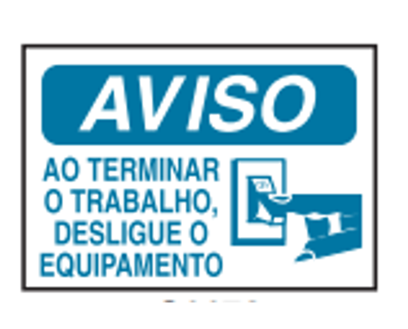 PLACA SINALIZACAO | MATERIAL: POLICLORETO POLIVINILA (PVC) | ACABAMENTO: VINIL AUTO ADESIVO | IDENTIFICACAO 1: AVISO | IDENTIFICACAO 2: AO TERMINAR O TRABALHO DESLIGUE O EQUIPAMENTO | CORES: BRANCA/AZUL | IMPRESSAO: AZUL | DIMENSOES: 250X180MM | MARCA: BRADY | REFERENCIA: C1172C