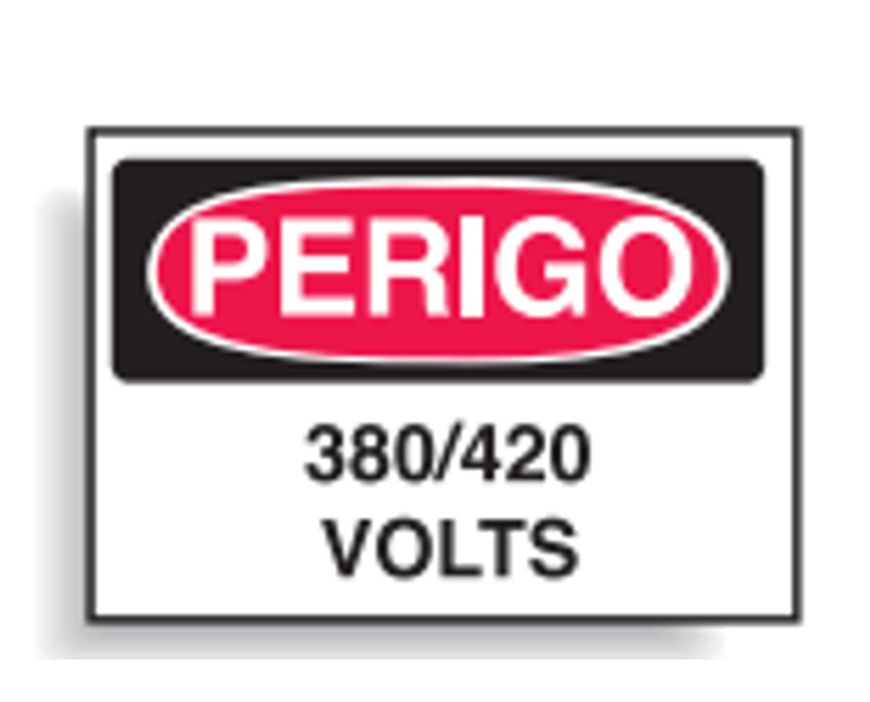PLACA SINALIZACAO | MATERIAL: ALUMINIO | ACABAMENTO: VINIL AUTO ADESIVO | IDENTIFICACAO 1: PERIGO | IDENTIFICACAO 2: 380/420 VOLTS | CORES: BRANCO/VERMELHO/PRETO | IMPRESSAO: PRETA | DIMENSOES: 350X250MM | MARCA: BRADY | REFERENCIA: C0089F