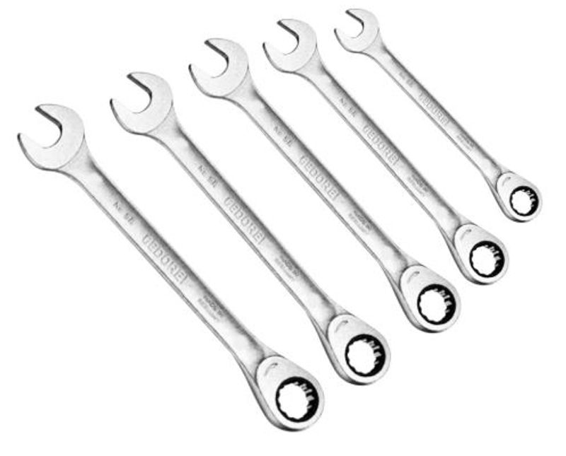 CHAVE COMBINADA JOGO | COMPOSICAO: 5 PECAS | TIPO: PLANA | FORMA: STANDARD | COM CATRACA: C/CATRACA | PERFIL: SEXTAVADO/ESTRIADO | MATERIAL: ACO CROMO VANADIO | TRATAMENTO SUPERFICIAL: NIQUELADO / CROMADO | EMBALAGEM: SUPORTE PLASTICO | TAMANHO: 8-19MM | MODELO: 9R | MARCA: GEDORE | REFERENCIA: 9R5M