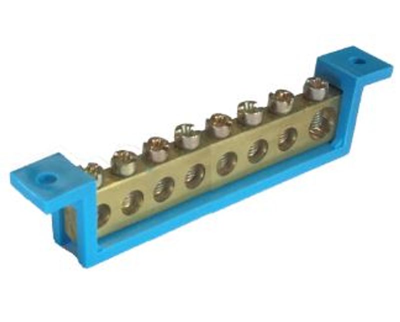 BARRAMENTO ELETRICO FASE | TIPO: NEUTRO 8 FUROS | MATERIAL: COBRE | REVESTIMENTO: SEM REVESTIMENTO | CORRENTE NOMINAL: 63/80A | DIMENSAO SECAO: 100MM | INFORMACOES ADICIONAIS: AZUL | MARCA: STECK | REF: SBN8