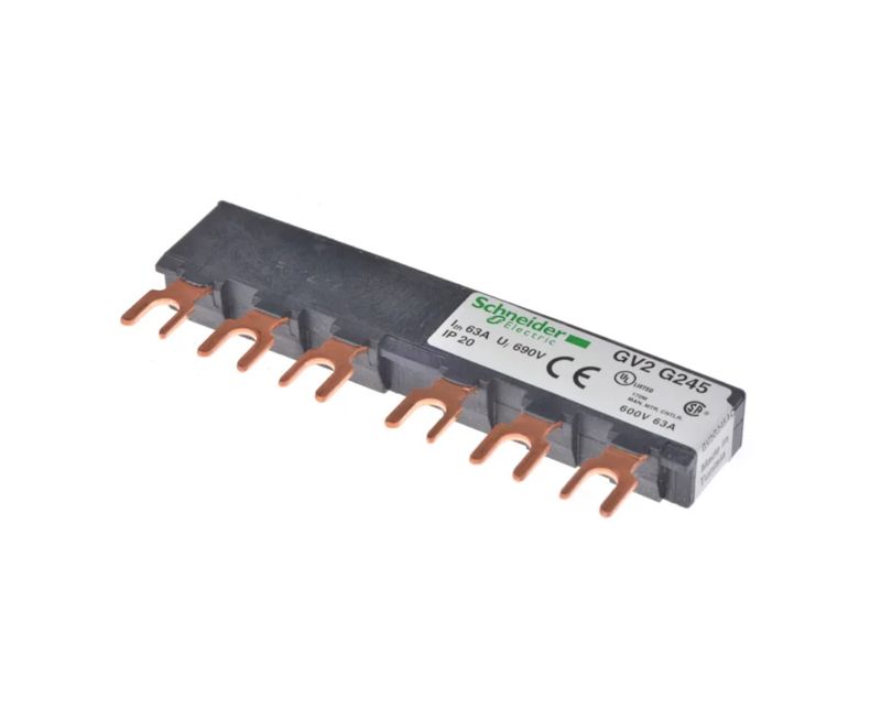 Jogo de barras tripolares GV2G245, corrente 63A, da linha Linergy FT da Schneider Electric. Com passo de conexão de 45 mm e 2 derivações. É um acessório que pode ser utilizado para fornecer energia para um grupo de dois disjuntores-motores.. Garante produtividade e eficiência otimizadas. do seu painel de controle, facilidade de instalação e alta confiabilidade.