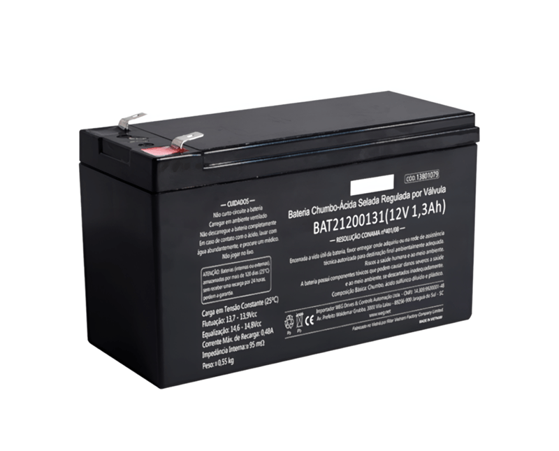 BATERIA ELETROELETRONICA | TIPO: CHUMBO-ACIDO | CARGA: RECARREGAVEL | TENSAO: 12V | CAPACIDADE: 1,3 AH | FORNECIMENTO: INDIVIDUAL | MARCA: WEG | REFERENCIA: BAT21200131