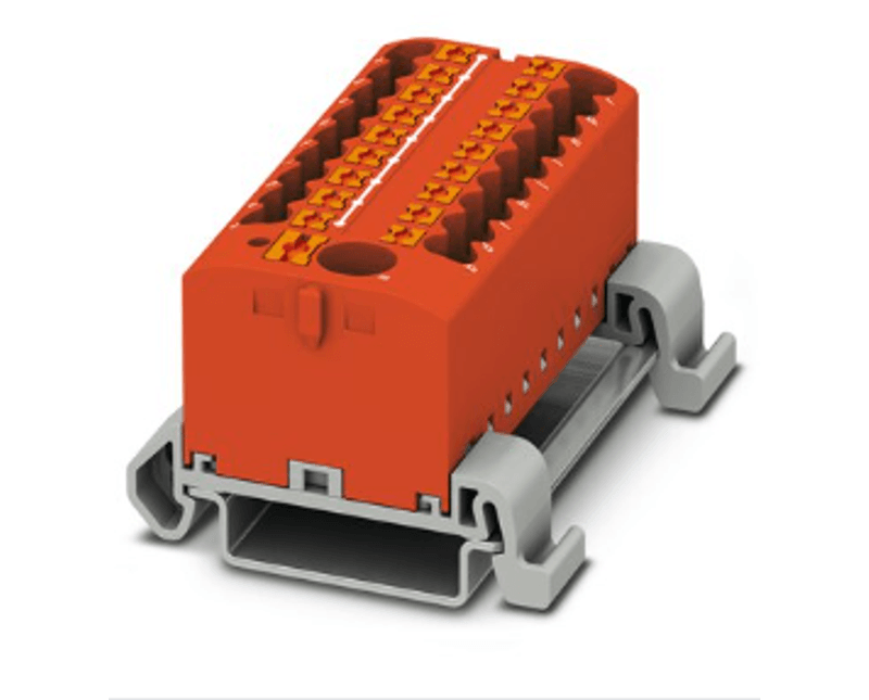 A estrutura deste bloco conector é feita de poliamida (nylon), o que garante resistência e durabilidade, além de uma operação confiável em uma faixa de temperatura entre -50°C e +120°C. A cor vermelha ajuda a identificá-lo facilmente no painel elétrico.