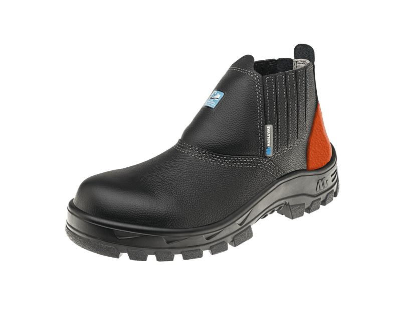 CALCADO SEGURANCA | TIPO: BOTINA | MATERIAL: COURO (VAQUETA) | FECHAMENTO: ELASTICO | SOLADO: POLIURETANO BIDENSIDADE | BIQUEIRA: COMPOSITE | PALMILHA: ANTIPERFURANTE (MONTAGEM FIBRAS) | CONSTRUCAO: CONVENCIONAL | COR: PRETA | COR TALONEIRA: LARANJA | TAMANHO: 34 a 46 | MODELO: LINHA COMPOSITE | MARCA: MARLUVAS | REF: 50B19MCPAPPAARC