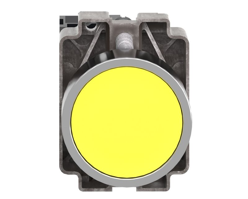 A cor amarela deste botão pode ser associada a funções específicas em sistemas de controle ou à identificação de determinadas operações. A presença da mola indica que este é um botão momentâneo, que retorna à posição original quando solto. Isso pode ser útil para funções temporárias ou de pulso.