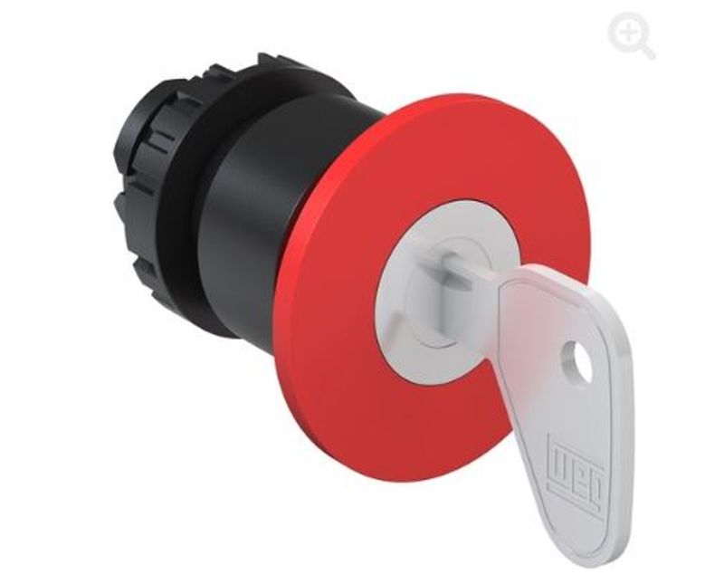 O botão de comando COG com chave de 40 mm da WEG é uma solução ideal para o controle de maquinarias e equipamentos industriais. Com uma fácil instalação em painéis elétricos, este botão possui um design moderno e inovador, com um cogumelo vermelho de fácil identificação e uma chave que proporciona mais segurança e evita o acionamento acidental. Sua furação de 22 mm é compatível com diversos tipos de painéis e seu acionamento é feito através de uma suave rotação no sentido horário para destravar.