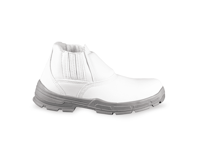 BOTINA DE PROTEÇÃO, COM ELÁSTICO LATERAL RECOBERTA, DORSO ACOLCHOADO, CONFECCIONADA EM MICROFIBRA HIDROFUGADA BRANCA, FORRAÇÃO INTERNA NA GÁSPEA EM NÃO TECIDO E FORRO DO CANO EM TECIDO DUBLADO COM MANTA DE NÃO TECIDO, SEM COMPONENTES METÁLICOS, PALMILHA DE MONTAGEM EM NÃO TECIDO, COM SOBREPALMILHA DE EVA 4MM E SOLADO DE POLIURETANO INJEÇÃO DIRETA BIDENSIDADE BICOLOR