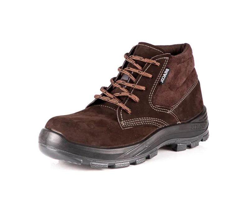 BOTINA DE PROTEÇÃO DE AMARRAR CANO ACOLCHOADO, CONFECCIONADA EM NUBUCK, COM FORRAÇÃO INTERNA NA GÁSPEA EM NÃO-TECIDO E FORRO DO CANO EM NYLON DUBLADO COM MANTA DE NÃO-TECIDO COM TRATAMENTO ANTIMICROBIANO, COM ETIQ. NA LINGUA, COM BICO PLASTICO, PALMILHA DE NÃO-TECIDO, COM SOBRE-PALMILHA EVA ANTIMICROBIANA E SOLADO DE POLIURETANO INJEÇÃO DIRETA BIDENSIDADE BICOLOR