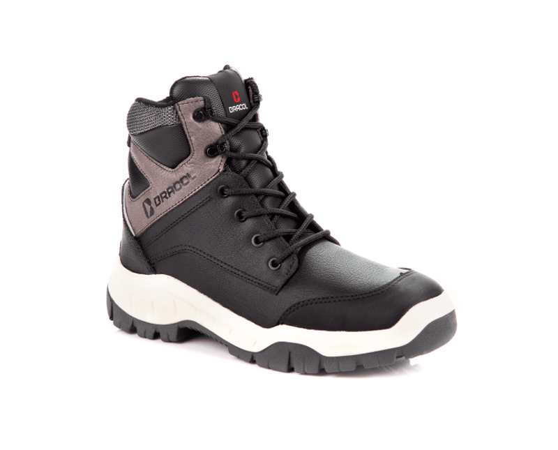 BOTINA PARA USO OCUPACIONAL DE AMARRAR CANO ACOLCHOADO, LÍNGUA FOLE, CONFECCIONADA EM VAQUETA DISCOVERY PRETA, COM FORRAÇÃO INTERNA NA GÁSPEA EM NÃO TECIDO E FORRO DO CANO EM NYLON COM EXCELENTE PODER DE ABSORÇÃO DE SUOR, COM BIQUEIRA PLASTICA, PALMILHA MONTAGEM EM NÃO TECIDO, SOBREPALMILHA DE POLIURETANO 8MM E SOLADO DE POLIURETANO INJEÇÃO DIRETA BIDENSIDADE BICOLOR