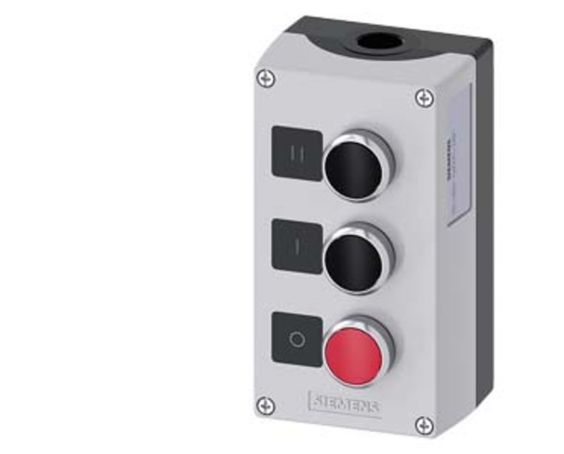 BOTOEIRA COMANDO MONTADA | MATERIAL: ACO CARBONO | COR CAIXA: PRETA | COR TAMPA: CINZA | CLASSIFICACAO: IP-66/IP-67/IP-69/IP-69K | FURACAO ENTRADA: 22MM | FUNCAO: LIGA/DESLIGA | GRAVACAO: I/O/II | BOTOES: 3 BOTOES | CONTATOS: 1NF | MODELO: 3SU1 | MARCA: SIEMENS | REFERENCIA: 3SU18530AD002AB1