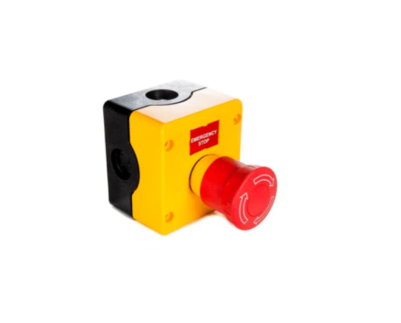 O dispositivo é equipado com um botão cogumelo de 22mm de fácil acionamento, que possibilita a interrupção imediata do processo em caso de emergência. Além disso, este modelo conta com 1NA+2NF, característica que garante maior versatilidade e possibilita o acionamento de múltiplas funções. A gravação "emergency stop" no botão cogumelo é uma indicação clara da função de emergência do dispositivo.