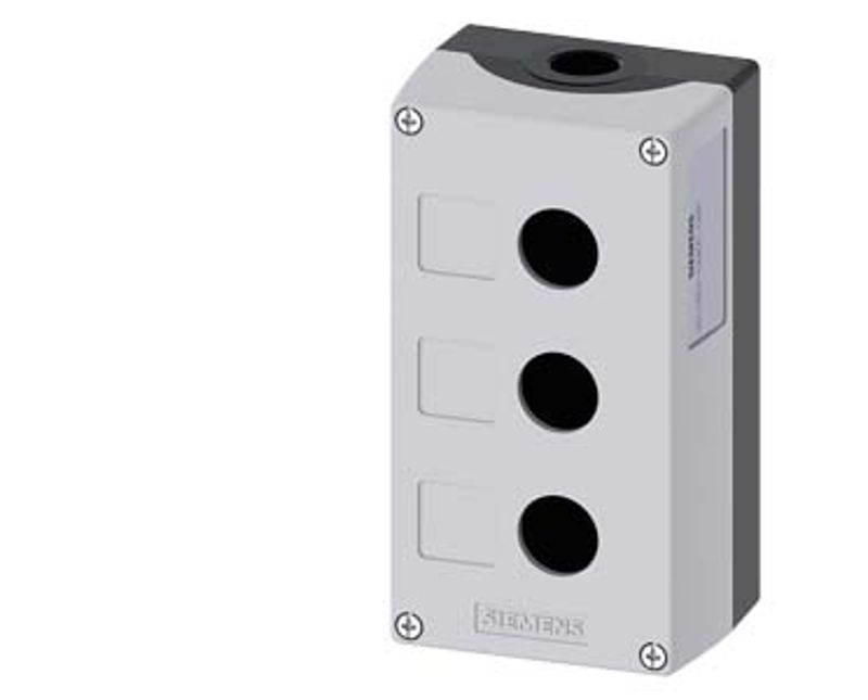 BOTOEIRA COMANDO VAZIA | MATERIAL: METAL | COR CAIXA: CINZA | COR TAMPA: CINZA CLARA | GRAU PROTECAO: IP-69 | QUANTIDADE FUROS: 3 FUROS | MEDIDA FURO: 22MM | TAMANHO CAIXA: 158,4X85X64MM | MODELO: SIRIUS ACT | MARCA: SIEMENS | REFERENCIA: 3SU18530AA000AB1