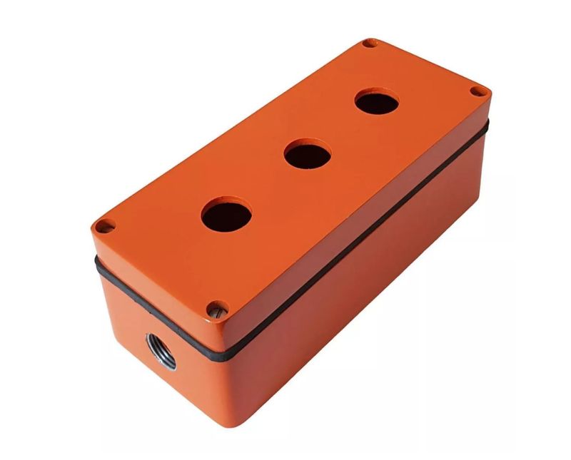 CX ABS P3/0322-C LR 80x160x85 caixa em termoplástico ABS Laranja usinada com 3 furos 22mm na tampa e 2 saídas laterais PG13,5 montada com tampão e prensa cabo. Sua utilização é indicada para condições normais de temperatura e uso em ambiente interno, tendo uma grande variadade de aplicações, tais como montagem e proteção de diferentes componentes de peças mecânicas, componentes eletrônicos ou elétricos botoeira, painéis para o segmento de elevadores ou uso industrial em geral, garantem praticidade e ganho de tempo na utlização direta nas mais diversas instalações de coamando e controle de acionamento. Produto disponível na cor Laranja. Material com grau de proteção de até IP 65 de conforme norma IEC 60529. Sua aplicação é indicada para condições normais de temperatura -20°C a +70°C
