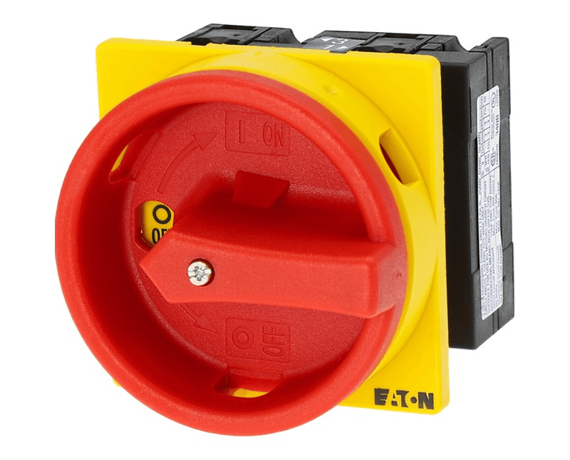 CHAVE COMUTADORA | TIPO: LIGA/DESLIGA | ANGULO COMUTACAO: 90 GRAUS | FIXACAO: FRONTAL/BASE | MANOPLA: KNOB | COR MANOPLA: VERMELHA | PLACA FRONTAL: QUADRADA | MATERIAL PLACA FRONTAL: COMPOSTO TERMOPLASTICO | COR PLACA FRONTAL: AMARELA | NUMERO POLOS: 2 POLOS | CORRENTE NOMINAL: 32A | MARCA: EATON | REFERENCIA: T31102EASVB