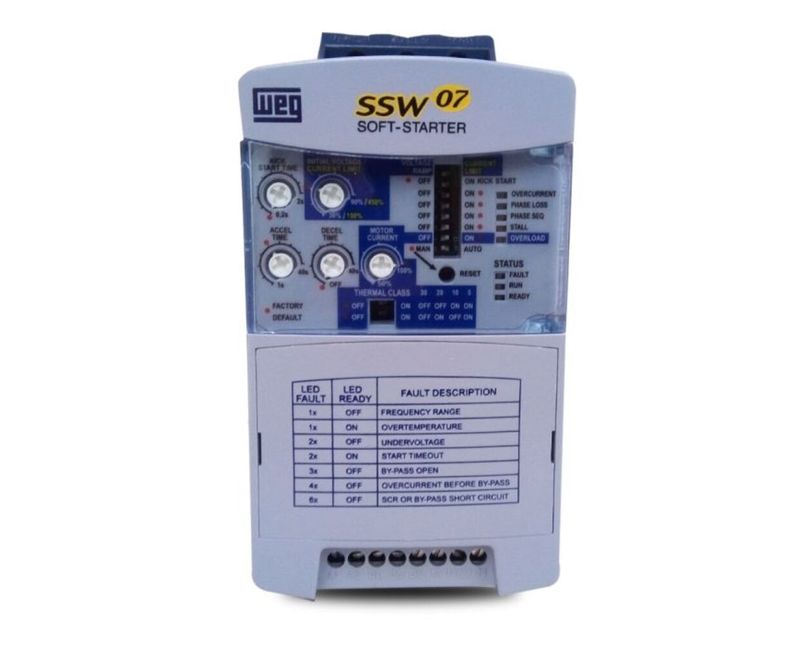 Com grau de proteção IP-20, o equipamento é resistente a poeira, água e outras condições ambientais adversas. Com tensão de alimentação que varia de 220V a 575V e corrente nominal de 17A, apresenta ainda tensão de controle de 110 a 220V. Sua tecnologia SSW07 proporciona uma partida mais suave e evita danos aos equipamentos elétricos.