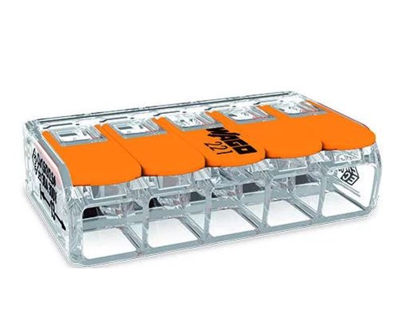 CONECTOR EMENDA FIOS/CABOS | TIPO: RETO | MATERIAL: TERMOPLASTICO | CLASSE DE TENSAO: 450V | CAPACIDADE: 0,5 - 6MM2 | COR: TRANSPARENTE | MODELO: 5 VIAS | MARCA: WAGO | REF: 221615