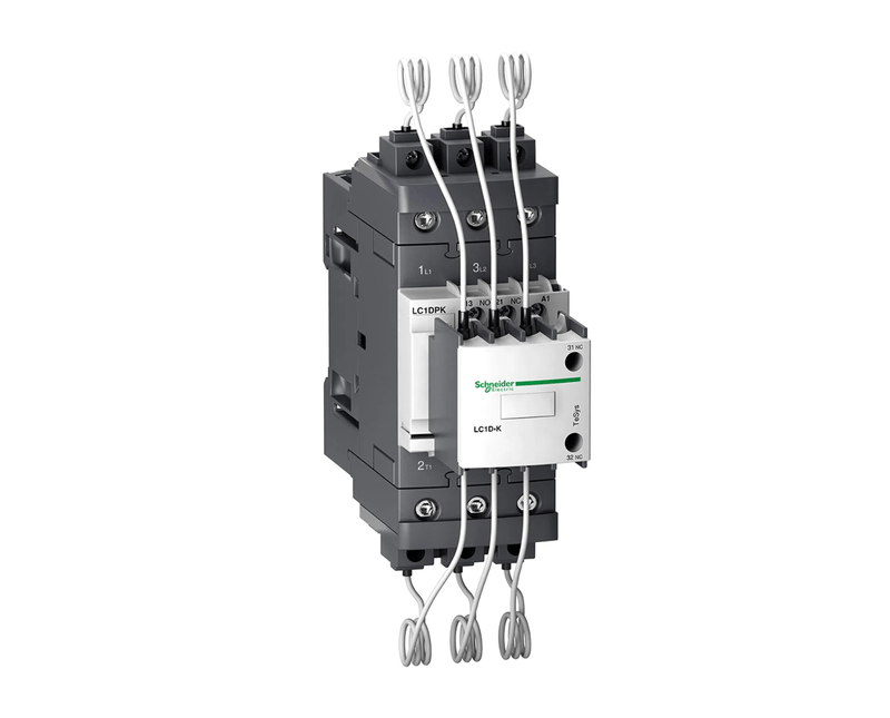 Contator LC1DPKM7 para comutação de bancos de capacitores trifásicos, utilizados para correção do fator de potência. Conexão direta, 30kVAR em 400/415V, 50/60Hz e bobina do circuito de comando de 220V. Vem com 1NA + 2NF para circuito de sinalização. Esses dispositivos estão em conformidade com as normas IEC 60070 e 60831, UL e CSA.
