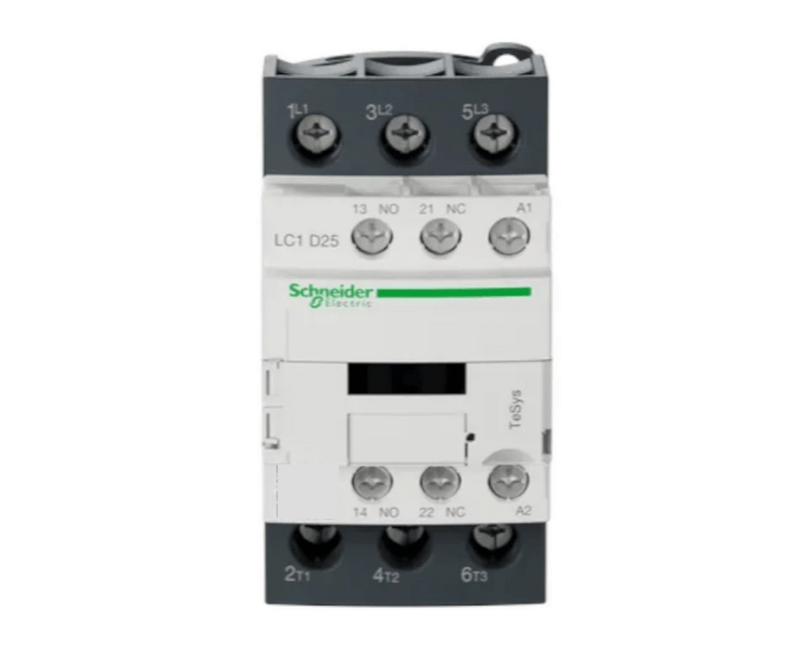 CONTATOR POTENCIA | NUMERO POLOS: TRIPOLAR | CORRENTE COMUTACAO: AC3 | CORRENTE: 25 A | TENSAO BOBINA: 24 VCA | FREQUENCIA: 50/60HZ | CONTATOS: 1NA+1NF | MARCA: SCHNEIDER| REF: LC1D25B7 - O LC1D25B7 é um contator TeSys D de 3 polos da - Schneider para aplicações de motores elétricos de até 11 kW a 380 V. Vem com uma bobina de 24V CA, frequência de 50/60 Hz, conexão por parafusos ou conectores e contatos auxiliares embutidos 1NA + 1NF. Pode ser utilizado em aplicações de segurança graças ao seu contato de espelho NF certificado. Montagem compacta em trilho DIN, que garante alta confiabilidade e durabilidade. Disponível em todo o mundo, é certificado para vários padrões (IEC, UL, CSA, CCC, EAC, Marine) e compatível com Green Premium (RoHs / Reach). - Produto compacto, 45 mm de largura, para trilho DIN e montagem em painel