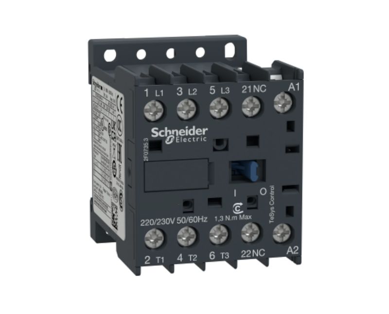 Contator tripolar 06A TeSys K - Schneider|O LC1K0601B7 é um contator tripolar e compacto da - Schneider Com corrente de 06A, destinado às aplicações de motores elétricos (AC-3) em 2,2kW@380V e aplicações com frenagem em contracorrente e acionamento por "impulsos" dos motores de gaiola ou de anéis (AC-4), como por exemplo máquinas de impressão, guindastes e talhas. Vem com contato auxiliar 1NF, bobina de 24V em corrente alternada e conexão por parafuso. Utilizado para aplicações de partida direta e reversa. Disponível em todo o mundo, está em conformidade com os padrões (IEC, UL, CSA, CCC, EAC e Marine) e é certificado como Green Premium (RoHs / Reach).