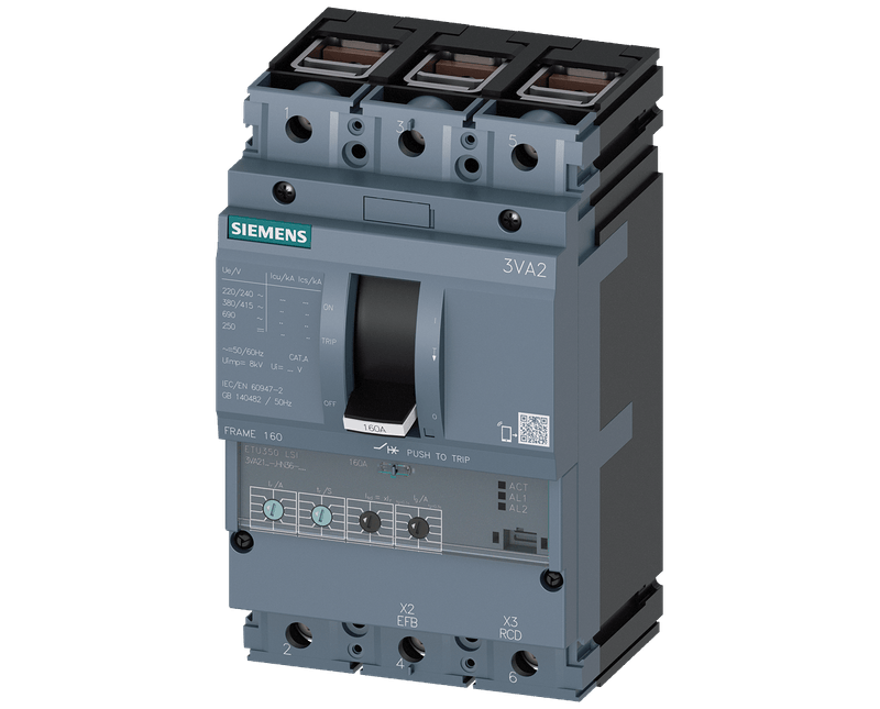 disjuntor 3VA2 IEC frame 160 classe da capacidade de comutação E Icu=200 kA @ 415 V de 3 polos, proteção de instalações ETU350, LSI, In=160A proteção contra sobrecarga Ir=63A ... 160A proteção contra curto-circuito Isd=1,5...10xIr, Ii=12xIn ligação de terminal Disjuntor compacto 3VA2 com ETU filas de 8 para proteção de instalações. Os disjuntores compactos 3VA da Siemens, sendo um elemento importante dos componentes de proteção SENTRON, ao nível de aplicações industriais e na área das infraestruturas, representam uma proteção efetiva para instalações, arrancadores e motor, graças ao desligamento seguro em caso de sobrecarga e curto-circuito. Os disjuntores compactos 3VA são, assim, uma referência ao nível da flexibilidade e versatilidade dos acessórios modulares. Acessórios uniformes para vários tamanhos de todas as séries de disjuntores compactos 3VA1 e 3VA2. Esta variante do disjuntor compacto 3VA distingue-se sobretudo por: 1. Modelo compacto. 2. Disponível como variante para proteção de instalações e proteção do gerador. 3. Disponível como versão de 3 e 4 polos. 4. Quatro classes de poder de corte/de fecho de 55 kA...150 kA com 415 V.5. Dependendo do tamanho: Corrente estipulada 25 A.630 A. 6. Possibilidade de montagem em montagem fixa, técnica de encaixe, unidade extraível. 7. A série dispõe de um dispositivo de ativação de sobrecorrente eletrónico. 8 Dispõe de um visor integrado para indicação dos valores medidos. 9 Função de medição integrada e ligação de comunicação opcional através de Modbus TCP, Modbus RTU, PROFINET e PROFIBUS. 10. Acessórios internos modulares e de fácil montagem com múltiplas funções.