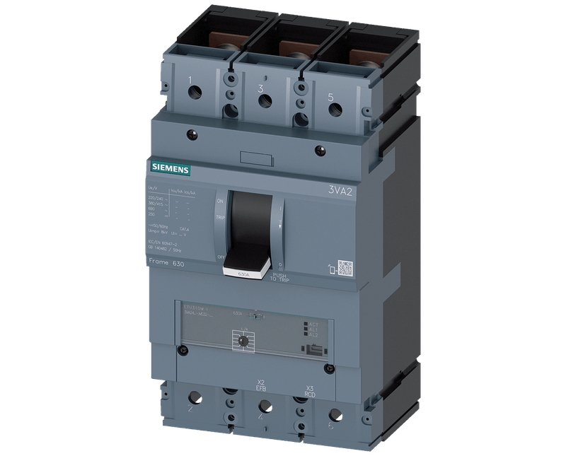 disjuntor 3VA2 IEC frame 630 classe da capacidade de comutação E Icu=200 kA @ 415 V de 3 polos, proteção do arrancador do motor ETU310M, I, In=400A proteção contra curto-circuito Ii=3...13 x In conexão roscada plana Disjuntor compacto 3VA2 com ETU filas de 8 para proteção de instalações. Os disjuntores compactos 3VA da Siemens, sendo um elemento importante dos componentes de proteção SENTRON, ao nível de aplicações industriais e na área das infraestruturas, representam uma proteção efetiva para instalações, arrancadores e motor, graças ao desligamento seguro em caso de sobrecarga e curto-circuito. Os disjuntores compactos 3VA são, assim, uma referência ao nível da flexibilidade e versatilidade dos acessórios modulares. Acessórios uniformes para vários tamanhos de todas as séries de disjuntores compactos 3VA1 e 3VA2. Esta variante do disjuntor compacto 3VA distingue-se sobretudo por: 1. Modelo compacto. 2. Disponível como variante para proteção de instalações e proteção do gerador. 3. Disponível como versão de 3 e 4 polos. 4. Quatro classes de poder de corte/de fecho de 55 kA...150 kA com 415 V.5. Dependendo do tamanho: Corrente estipulada 25 A.630 A. 6. Possibilidade de montagem em montagem fixa, técnica de encaixe, unidade extraível. 7. A série dispõe de um dispositivo de ativação de sobrecorrente eletrónico. 8 Dispõe de um visor integrado para indicação dos valores medidos. 9 Função de medição integrada e ligação de comunicação opcional através de Modbus TCP, Modbus RTU, PROFINET e PROFIBUS. 10. Acessórios internos modulares e de fácil montagem com múltiplas funções.