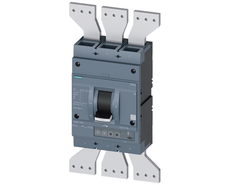 DISJUNTOR CAIXA MOLDADA | NUMERO POLOS: TRIPOLAR | ELEMENTO PROTECAO: ELETRONICO | TENSAO NOMINAL: 380V | CORRENTE NOMINAL: 1250A | CAPACIDADE RUPTURA (ICU): 55KA | MARCA: SIEMENS | REFERENCIA: 3VA26125HN320AA0
