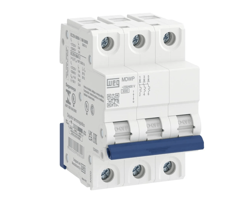 DISJUNTOR MINI | MONTAGEM: TRILHO (DIN) | TIPO DE TERMINAL: PARAFUSO | TIPO: TERMOMAGNETICO | NUMERO POLOS: TRIPOLAR | CORRENTE: 6A | TENSAO NOMINAL: 220/400V | CURVA: C | CLASSIFICACAO / GRAU PROTECAO: IP-20 | CAPACIDADE RUPTURA (ICU): 5KA | MODELO: MDWP | MARCA: WEG | REF: MDWPC63