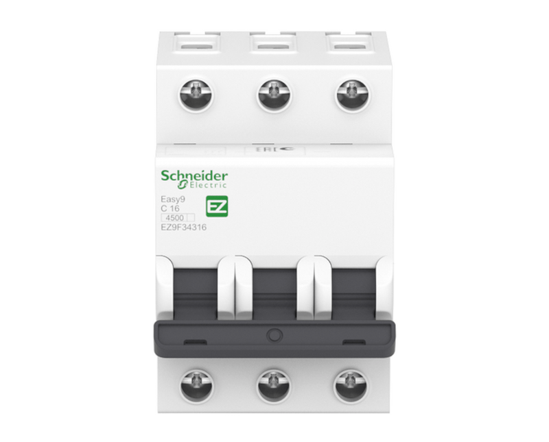 Disjuntor Termomagnético Easy9 EZ9F33316, 3 polos, 16 amperes no máximo a 400Vca, associa as funções de proteção contra sobrecorrentes (sobrecargas e curtos-circuitos) e seccionamento dos circuitos elétricos em instalações elétricas residenciais, respondendo as necessidades com um produto robusto e realizando instalações confiáveis e seguras e suporte de montagem em trilho DIN que permite uma instalação mais rápida e segura - • Proteção contra choques elétricos, sobrecargas, curtos-circuitos e descargas atmosféricas (raios);