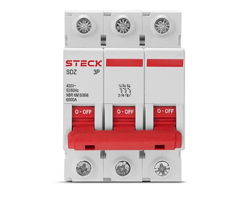 A linha de mini-disjuntores Steck são equipamentos de alta tecnologia que protegem fios e cabos elétricos contra curto-circuitos e sobrecargas de energia, proporcionando aplicações seguras e econômicas em instalações elétricas residenciais, comerciais e industriais. Possuem contratos especiais de prata que oferecem garantia de segurança contra soldagem. Além disso são produtos de disparo livre, isto é, podem disparar mesmo com a alavanca de acionamento travada na posição "liga". Certificado na norma NBR NM 60898 até 63A, e as correntes de 80A, 100A e 125A certificadas na norma IEC 60947-2 A linha de mini-disjuntores Steck são equipamentos de alta tecnologia que protege fios e cabos elétricos contra curto-circuitos e sobrecargas de energia, proporcionando aplicações seguras e econômicas em instalações elétricas residenciais, comerciais e industriais. O disjuntor protege a instalação elétrica contra sobrecargas e curtos-circuitos. Ele se conecta facilmente ao trilho DIN e geralmente é instalado no quadro de distribuição, tem corrente nominal de 6A, tripolar (3P), capacidade de interrupção de 6kA e curva de disparo tipo C (proteção de circuitos em geral, que também possam ter cargas de natureza indutiva, que apresentam picos de corrente). O disjuntor protege a instalação elétrica contra sobrecargas e curtos-circuitos. Ele se conecta facilmente ao trilho DIN e geralmente é instalado no quadro de distribuição, tem corrente nominal de 6A, tripolar (3P), capacidade de interrupção de 6kA e curva de disparo tipo C (proteção de circuitos em geral, que também possam ter cargas de natureza indutiva, que apresentam picos de corrente). Mini Disjuntor