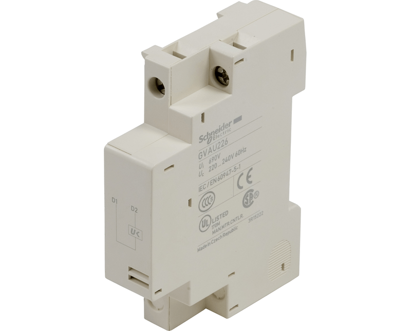 Disparador elétrico para TeSys GV2 e GV3 da Schneider Electric, por mínima tensão. Tensão do circuito de controle 220V...240V, limites de tensão do circuito de controle 0,85...1,1 Vn e tensão limiar de disparo 0,7...0,35 Vn. O GVAU226 é utilizado para desligar o disjuntor quando a tensão detectada atingir um valor mínimo definido pelo fabricante.. O disparador elétrico GVAU226 é compatível com: GV2L, GV2LE, GV2ME, GV2P, GV3L e GV3P. Durabilidade mecânica de 10000 ciclos com GV3P e GV3L , e 30000 ciclos com GV2ME e GV2P.