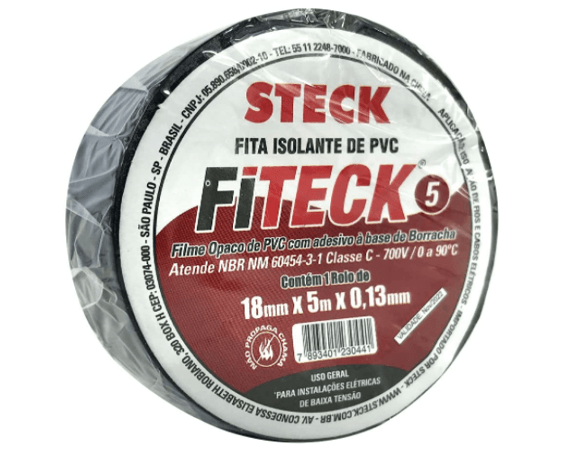 FITA ISOLANTE | COR: PRETA | LARGURA: 18MM | COMPRIMENTO: 5M | INFORMACOES ADICIONAIS: POLICLORETO VINILA ESPESSURA 0,13MM TEMPERATURA 0-90GRC TENSAO ISOLACAO 700V | MODELO: FITECK | MARCA: STECK| REF: SFT1305