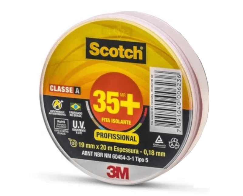 A fita Scotch 35+ é fácil de manusear e aplicar, com medidas de largura de 19mm e comprimento de 20m. Para facilitar a identificação, a fita possui cor branca e é apresentada em embalagem individual. Seu material é feito de PVC durable, garantindo alta aderência em diversos tipos de superfícies, mesmo nos casos em que a troca do isolamento elétrico seja necessária.