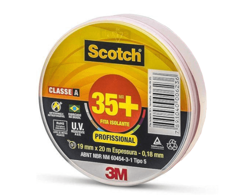 A fita isolante Scotch 35+ da 3M é a solução completa para as suas necessidades de isolamento elétrico. Com sua cor vermelha vibrante, esta fita é facilmente identificável em fiações complexas e possui aprovacao Classe A, garantindo total segurança em ambientes de até 750V (0,75KV) e 90 graus Celsius.