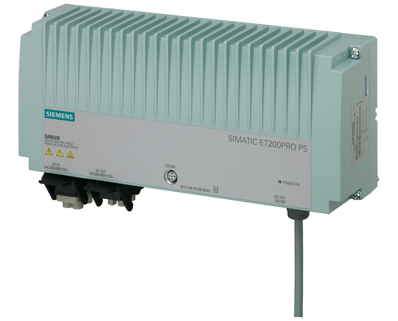 SIMATIC DP, FONTE DE ALIMENTAÇÃO PS ESTABILIZADA PARA ET 200PRO, COM GRAU DE PROTEÇÃO IP67, ENTRADA: 400-480V AC E SAÍDA: 24V DC / 8A. O COMPONENTE DE REDE SIMATIC ET200PRO PS COM O TIPO DE PROTEÇÃO IP67 SERVE PARA A ALIMENTAÇÃO DO SISTEMA ELETRÔNICO/SENSOR E A ALIMENTAÇÃO DE TENSÃO DE CARGA DO PERIFÉRICO E POSSUI UM CONTATO DE SINALIZAÇÃO PARA "24 V O. K." E "EXCESSO DE TEMPERATURA", ASSIM COMO UM SEGUNDO CONECTOR ENCAIXÁVEL PARA A PASSAGEM DE MALHA DA TENSÃO DE ENTRADA. NÃO IMPORTA O SETOR OU O REQUISITO – A SIEMENS DISPONIBILIZA ALIMENTAÇÕES DE CORRENTE CONFIÁVEIS E EFICIENTES PARA CADA INSTALAÇÃO.
