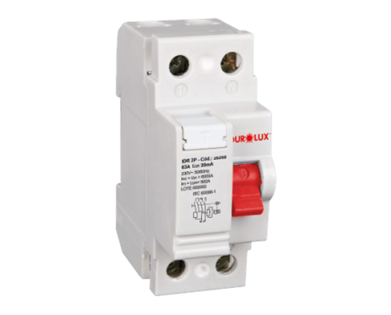 INTERRUPTOR DIFERENCIAL RESIDUAL | NUMERO POLOS: BIPOLAR | DISPARO: INSTANTANEO | TENSAO NOMINAL: 230VCA | CORRENTE NOMINAL: 63A | SENSIBILIDADE: 30MA | MONTAGEM: TRILHO (DIN) | MARCA: OUROLUX| REF: 26202